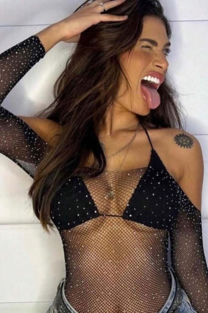 Este body es pura actitud. Su diseño de red transparente, cubierto de strass, te hará brillar y capturar todas las miradas. Las mangas largas y el cuello cerrado añaden un toque de sofisticación, mientras que la transparencia revela lo justo para un look atrevido y sensual.