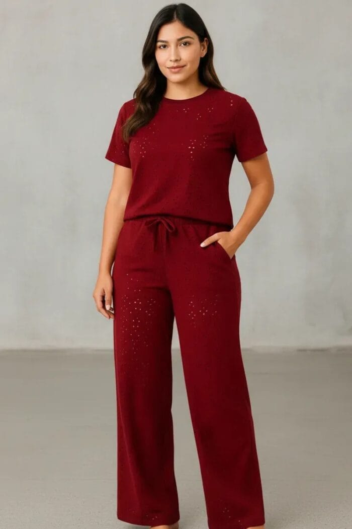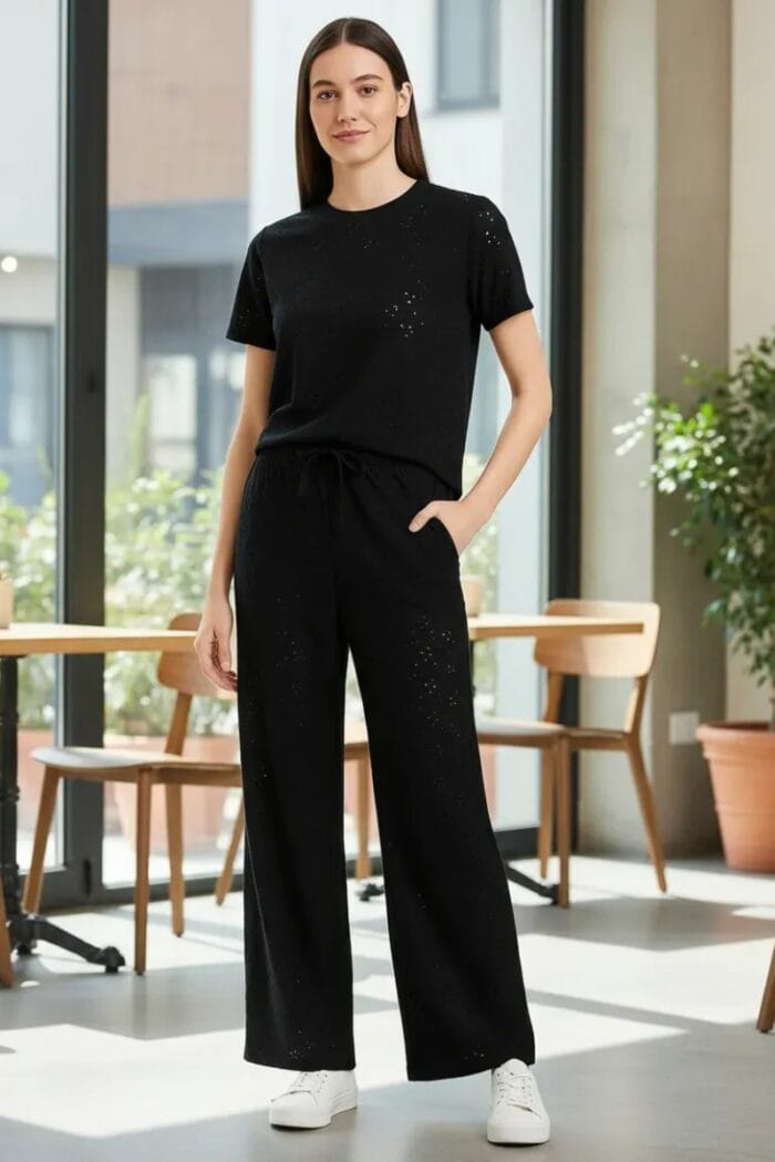 La camisa de manga corta y cuello redondo ofrece un calce relajado y liviano, mientras que el pantalón palazzo con cintura elástica y cordón regulable garantiza comodidad y movimiento.