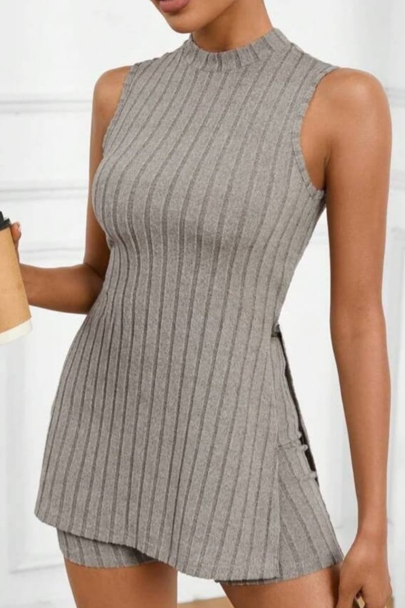 Su musculosa sin mangas con aberturas laterales aporta un toque moderno y fresco, mientras que el short corto con pretina elástica brinda confort para todo el día.