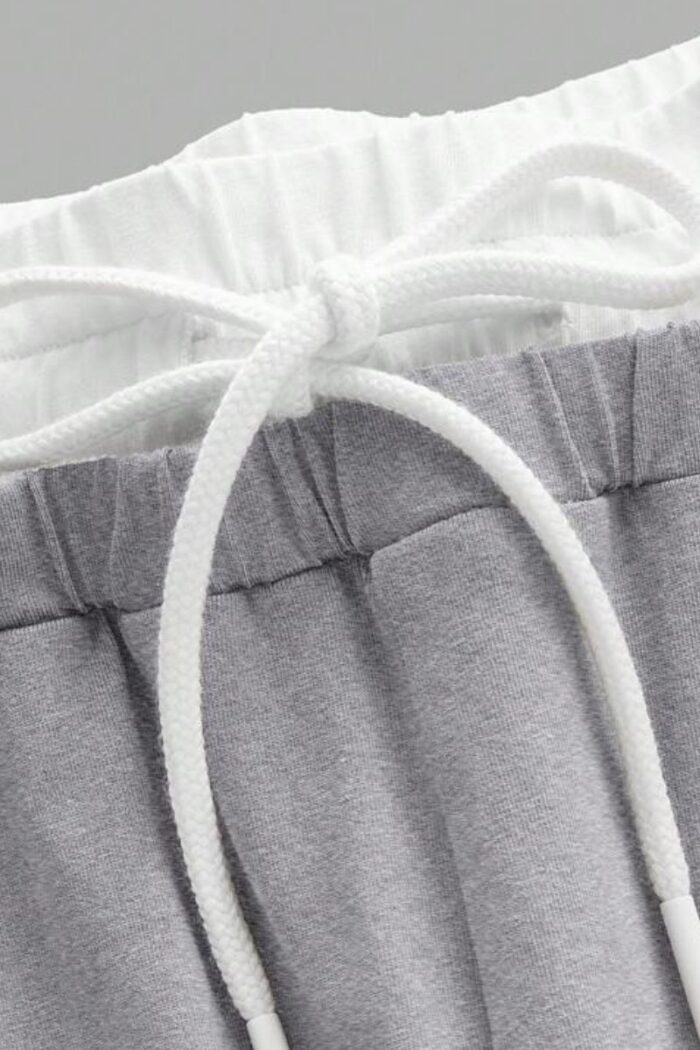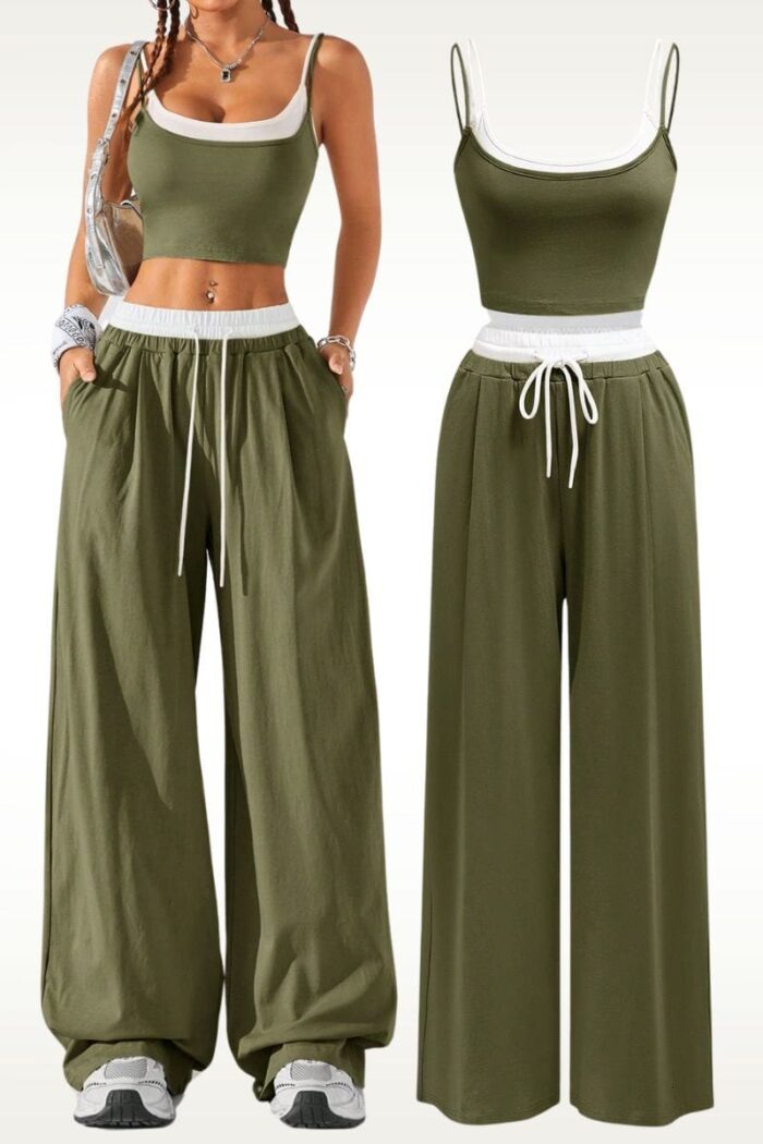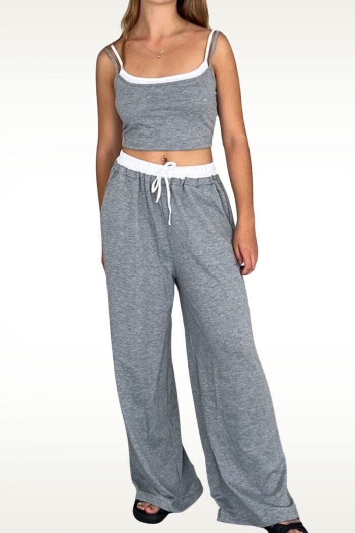 - Pantalón Largo: De cintura alta con banda elástica y cordón ajustable. Su corte amplio permite libertad de movimiento, mientras que el diseño estiliza y alarga la figura.
