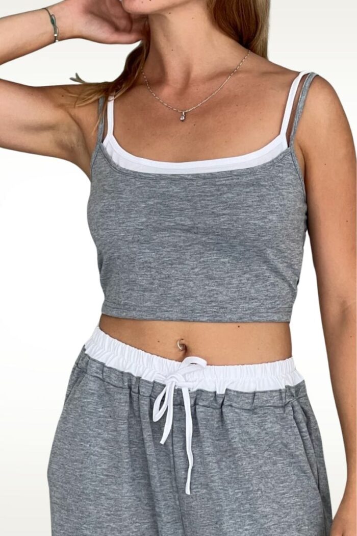 - Crop Top: Diseño sin mangas con tirantes finos, ofreciendo un ajuste cómodo y moderno. Su estilo minimalista y femenino lo hace ideal para cualquier ocasión.