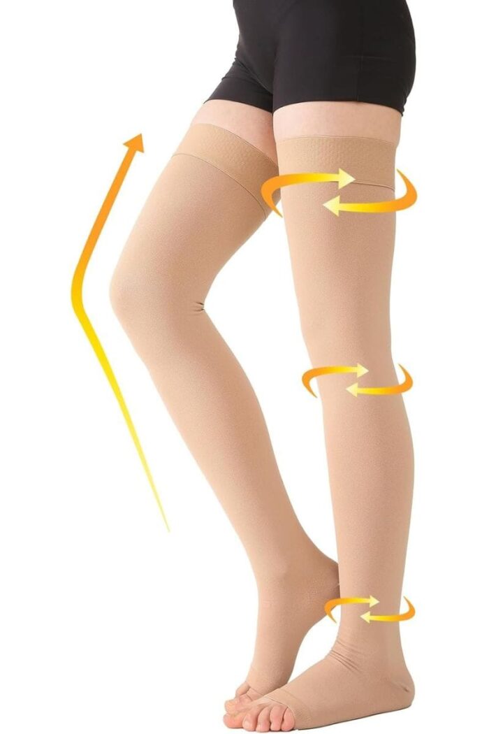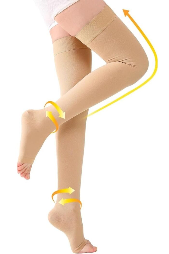 Ofrecen una compresión graduada que estimula el retorno venoso, ayudando a prevenir várices, edemas y molestias típicas de la jornada laboral, el embarazo o los viajes largos. Son abiertas en la punta para mayor confort y ventilación, y su diseño anatómico asegura que se mantengan en su lugar todo el día sin enrollarse ni bajar.