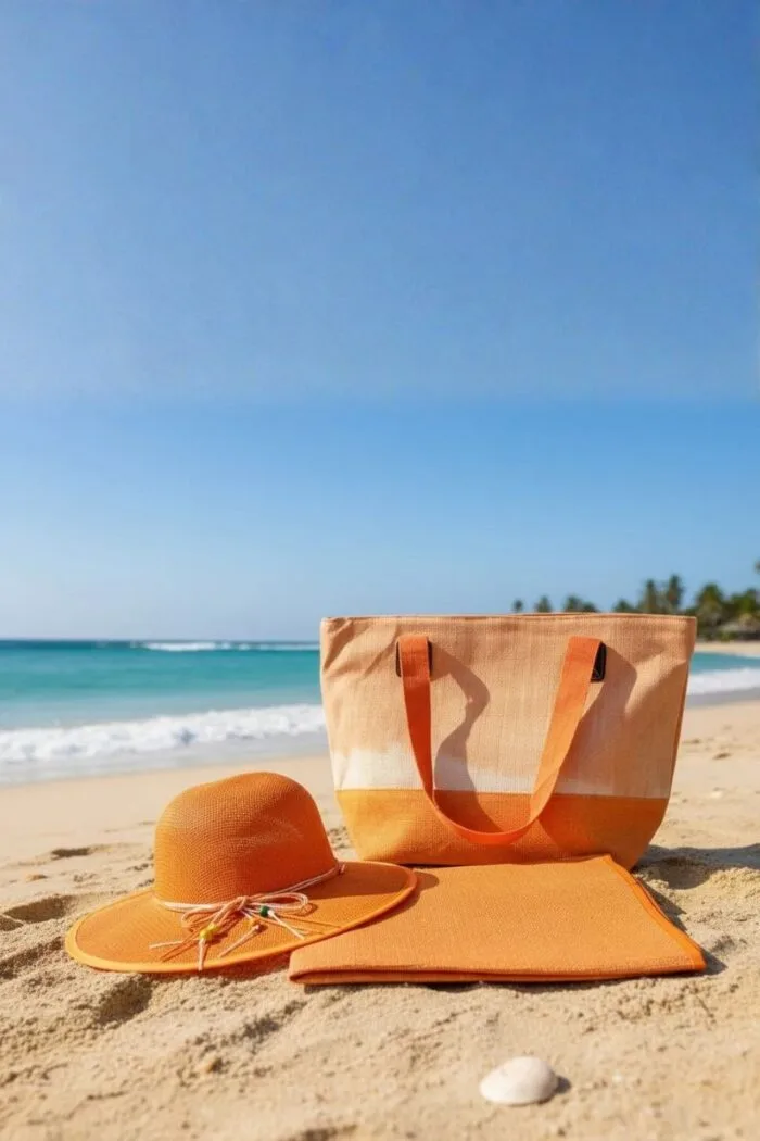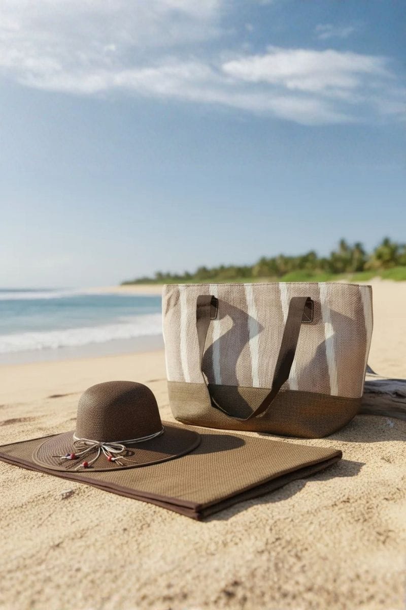 - Este conjunto incluye un bolso amplio, un sombrero elegante y una esterilla resistente de 70 cm de ancho y 100 cm de largo, todo fabricado con materiales sintéticos duraderos, ligeros y fáciles de limpiar.