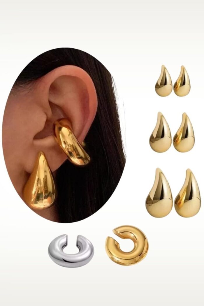 Este set de aros caravanas Gota de Agua es la última tendencia en moda chunky. Con un diseño audaz y moderno, estos aros combinan perfectamente la elegancia del oro y el brillo del metal pulido. Las gotas de agua en plata aportan un toque de sofisticación, mientras que los aros gruesos dorados añaden un estilo contemporáneo y llamativo.